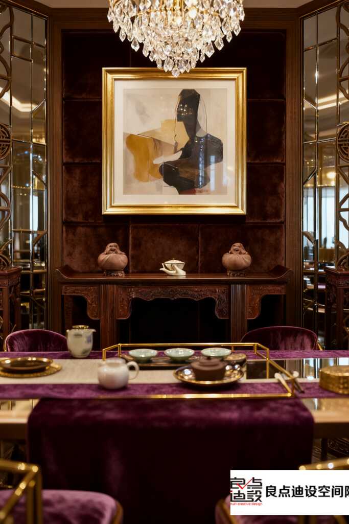 一進門,整個空間的基調(diào)就被定下了。深色實木桌椅是骨架,穩(wěn)得住場子。但妙就妙在,設(shè)計師給每把椅子都“穿”上了酒紅色的絲絨坐墊!絕不絕?木質(zhì)的中式感還在,但絲絨的貴氣和慵懶感一下子漫出來了,坐上去感覺不是來喝茶,是來談一場風(fēng)花雪月的。