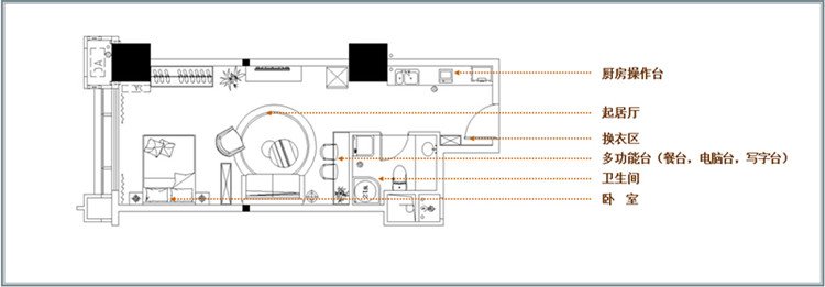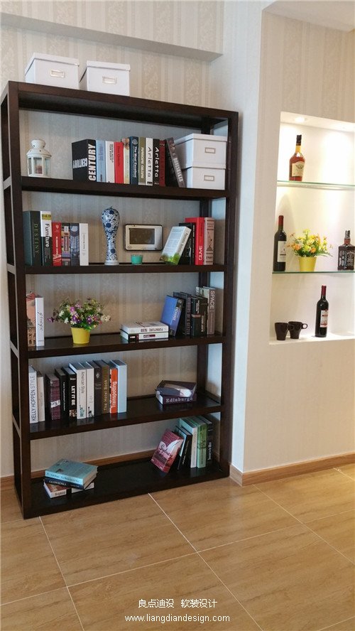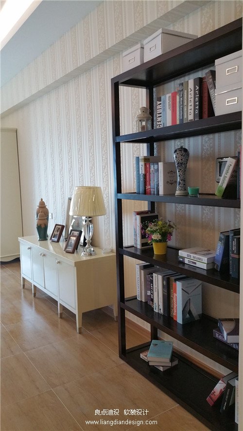 空間軟裝色彩:深胡桃木色 乳白色、淡藍(lán)色