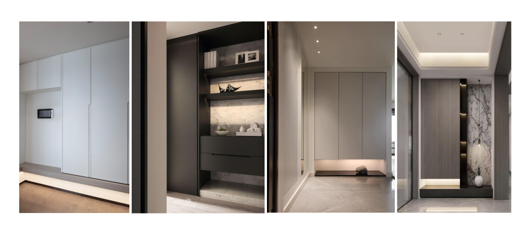 玄關(guān)做一個(gè)嵌入型玄關(guān)柜,順著墻的一邊擺放,如果走廊比較寬的話,可以擺成兩排,增加收納空間,建議I型。