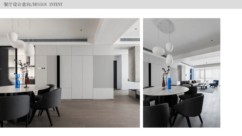 餐廳借助門廳長走廊,放置六人位的圓桌,原始布局餐廳位置稍小,所以沒有收納的區(qū)域,利用西墻增加收納設(shè)置餐邊柜,作為廚房區(qū)域收納的補(bǔ)充或者當(dāng)做酒柜也是極好的。