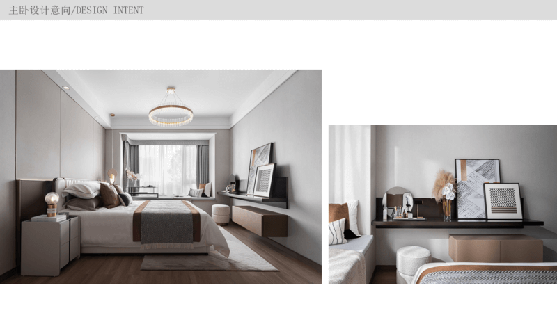 主臥 交付時(shí)帶有飄窗,可以將飄窗位置利用起來,改造成一個(gè)mini的學(xué)習(xí)區(qū),背景墻按照風(fēng)格和喜好做硬包,在床尾設(shè)立斗柜和化妝臺,滿足女主人的日常需求,因?yàn)橹髋P帶衣帽間,所以收納已經(jīng)足夠了,主要以裝飾和體驗(yàn)感為主。