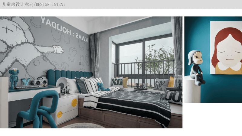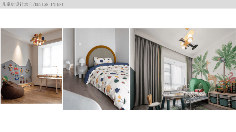 兒童房 主要以學(xué)習(xí)空間為主,用軟裝飾品來區(qū)分性別,如果業(yè)主孩子年紀(jì)較小也可以將這個(gè)房間當(dāng)做親子互動區(qū),小孩子都比較愛創(chuàng)造,那么可以設(shè)計(jì)一面黑板墻或者積木墻用來“亂涂亂畫”。