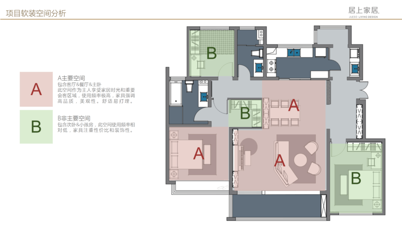 對于整體空間,一定要有主次之分(如上圖),整個(gè)空間一定以客廳、門廳、餐廳,同時(shí)包括主臥作為整體空間的 主要空間,當(dāng)然使用頻率相對更高,家具更強(qiáng)調(diào)品質(zhì)和美觀,同時(shí)具備舒適性,便于打理。
