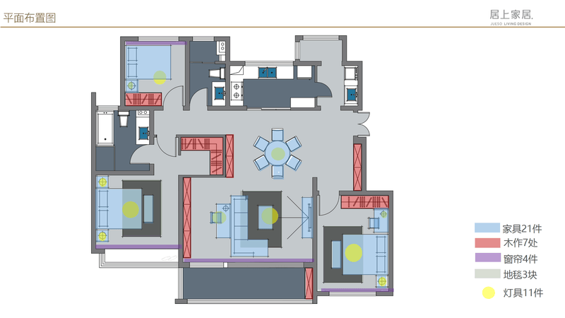 可以看出,以常規(guī)布局統(tǒng)籌出來家具、整體定制柜、窗簾、地毯、燈具等需要的數(shù)量;
