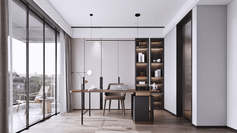 或者只作為獨(dú)立書房時需要規(guī)劃足夠的收納空間,靠墻定制書桌+書柜,可容納多人使用,便于工作學(xué)習(xí)。開放式與封閉式并存的書柜,既可以擺放書籍,也可以擺放裝飾品。