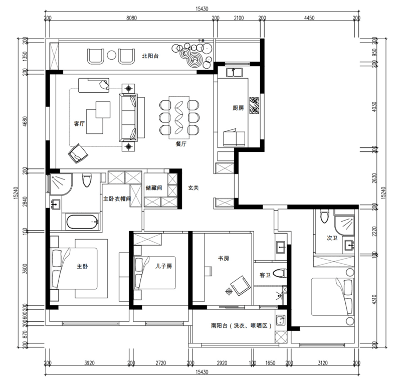 因為這個戶型南北都有陽臺所以南陽臺主要用作洗衣晾曬,北陽臺作為休閑區(qū),種種鮮花綠植等。四個房間均朝南,保留其中三間臥室均帶有飄窗,居住起來比較舒適,兩間作臥室套房,一間為主臥,另一間可以作為長輩房,使用起來更加方便;兒子房靠近書房,臥室比較小,只做基礎(chǔ)的收納和滿足睡眠需求,學(xué)習(xí)主要在書房完成,提高空間的使用頻率。