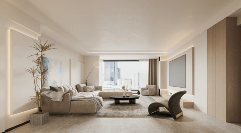 進(jìn)門看見的是客廳,可以兩邊靠墻做頂天立地式收納柜,打造一個兼具美觀與實用的入戶空間,既能提升家的顏值,又能為家打造一個功能區(qū)。如果不考慮儲物,就可以用玻璃作為隔斷。玻璃隔斷不會影響室內(nèi)采光,還有增加室內(nèi)通透感的作用。