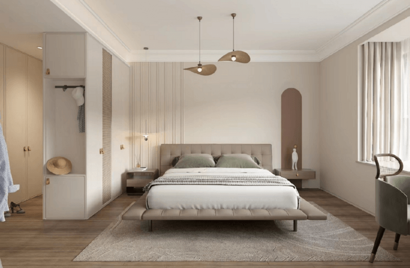 次臥相比主臥要小很多,利用床頭墻面,打造收納+書柜一體化定制床頭柜。打造沉穩(wěn)、淡雅、溫暖的感覺, 忌過冷、艷、暗、亮。