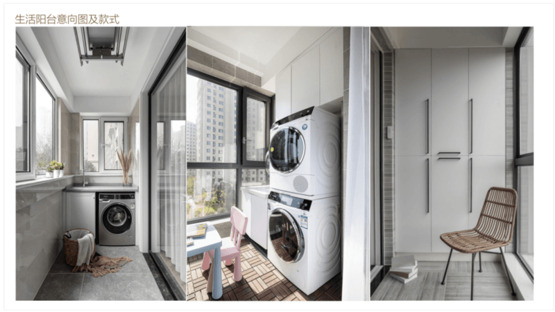 在生活陽臺上設(shè)計洗衣池,可以選一體式臺盆,帶三面擋水。遵循上烘下洗的原則,衣服拿出來就可以穿,減少晾曬時間。轉(zhuǎn)角的空間剛好收納家政工具,適當(dāng)利用洞洞板進(jìn)行收納,更加整潔。
